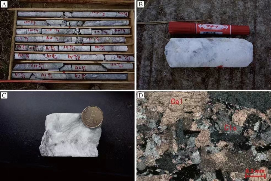 麻山头锶矿区天青石矿石照片(A,B,C—矿石照片,D—镜下照片中股网,Cal—方解石,Cls—天青石)。