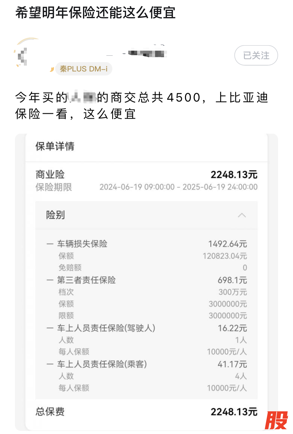 另一位比亚迪秦的车主也“晒”出了比亚迪财险的报价,交强险和商业车险合计保费为3316.4元。据其介绍,其他保司的报价在4000元左右,比亚迪财险的报价较其他保司的价格低了两成左右。