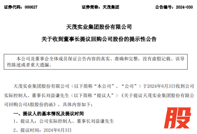 6月3日,天茂集团收到刘益谦《关于提议天茂实业集团股份有限公司回购公司A股股份的函》。