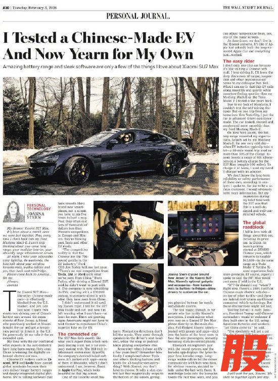 2月6日,小米公司创始人、董事长、首席执行官雷军发文称,《华尔街日报》前几天报道了小米SU7:科技专栏作家Joanna Stern 找朋友借了辆小米SU7 Max,在美国新泽西试驾了两周,盛赞SU7的驾驶体验和生态。
